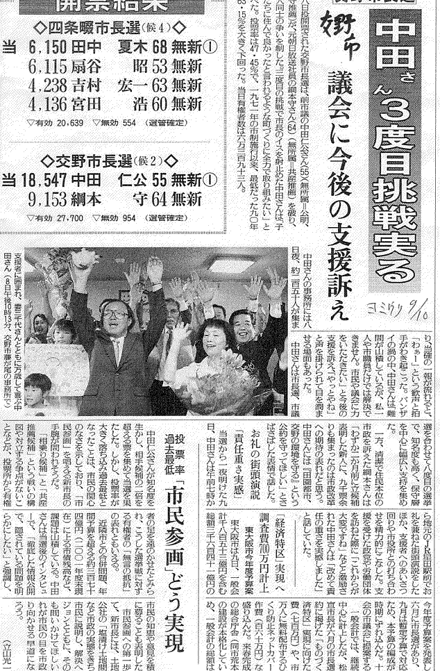 四条畷市、交野市 両市の選挙結果を伝える9/10朝刊