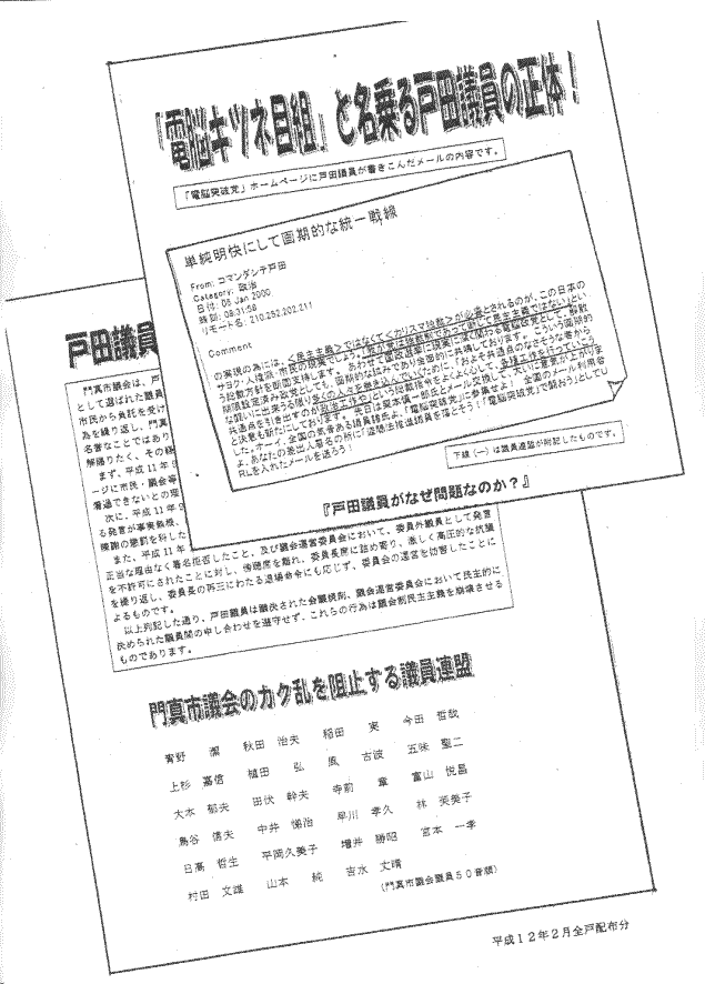 この裏面にはなんと、懐かしの「門真市議会のカク乱を阻止する議員連盟」ビラの復刻がなされているではありませんか!表面での戸田非難は「事実に基づかない情報隠蔽とか職務怠慢など」とそれこそ事実に反する誹謗中傷証拠を記してくれたり、「共産党議員が終始弁護!」として共産党の道理ある議会共闘を攻撃したり、「明らかに門真市の税金を左翼運動に使っていることになり断じて許せません。」と意味不明の文句付けをしたり、と、彼等の知性のほどを実に良く示してくれていて、マニア垂涎モノです。