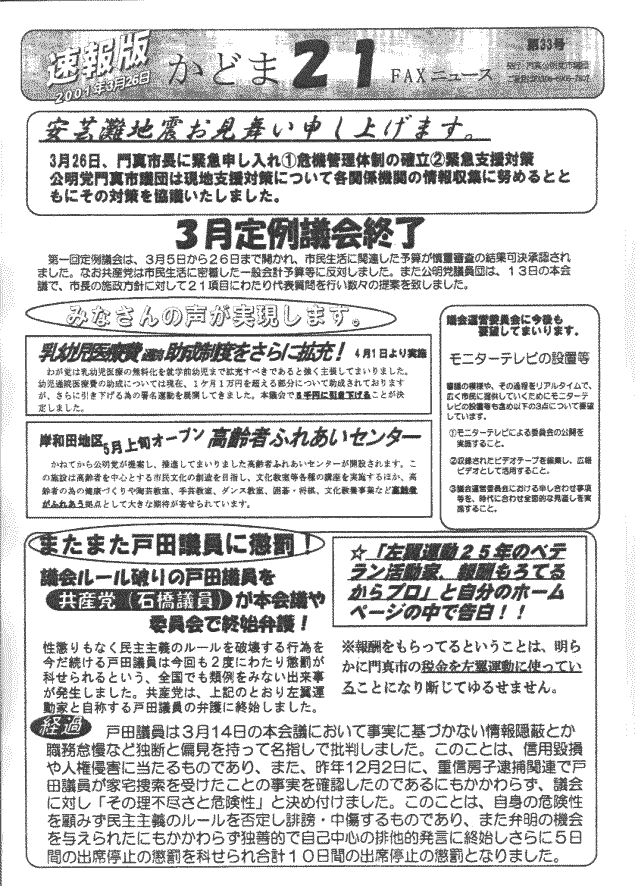 本来は公明党支援者向けであるはずの「FAXニュース」。第33号ということですから、バックナンバーもおかしさ抜群のはずです。ご意見ご希望は「発行;門真公明党市議団FAX06-6905-7807」までどうぞ!