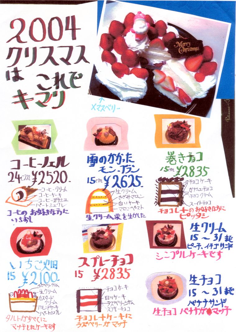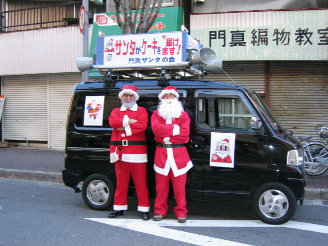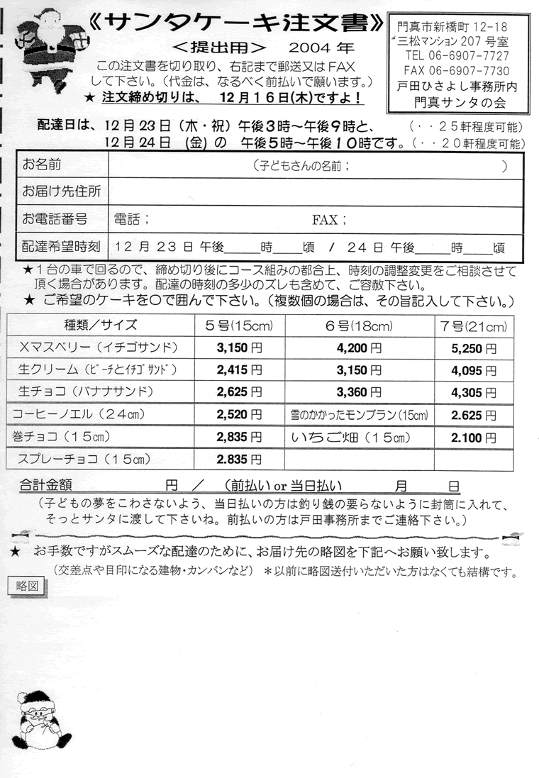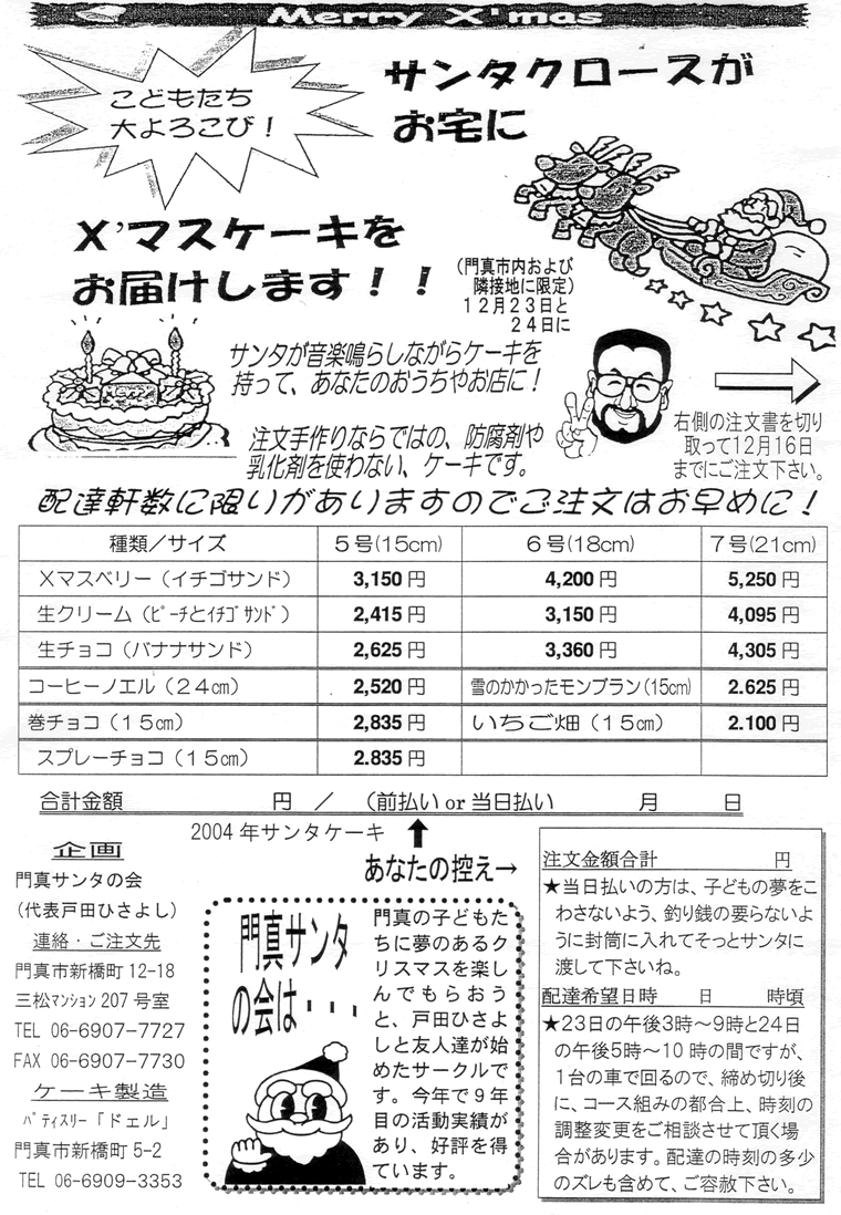 04’サンタケーキ大好評でした! ★今年で9年目のサンタケーキ。今まで一度も雨に降られていないという幸運に恵まれています。 さて今年は門真市直近の人にも大サービスで、守口市の梶町、藤田町、東町のお宅も配達範囲に含めることにいたします。 それではみなさん、よいクリスマスを! 詳細並びに申込書は↓ 前年までの写真等はこちら
