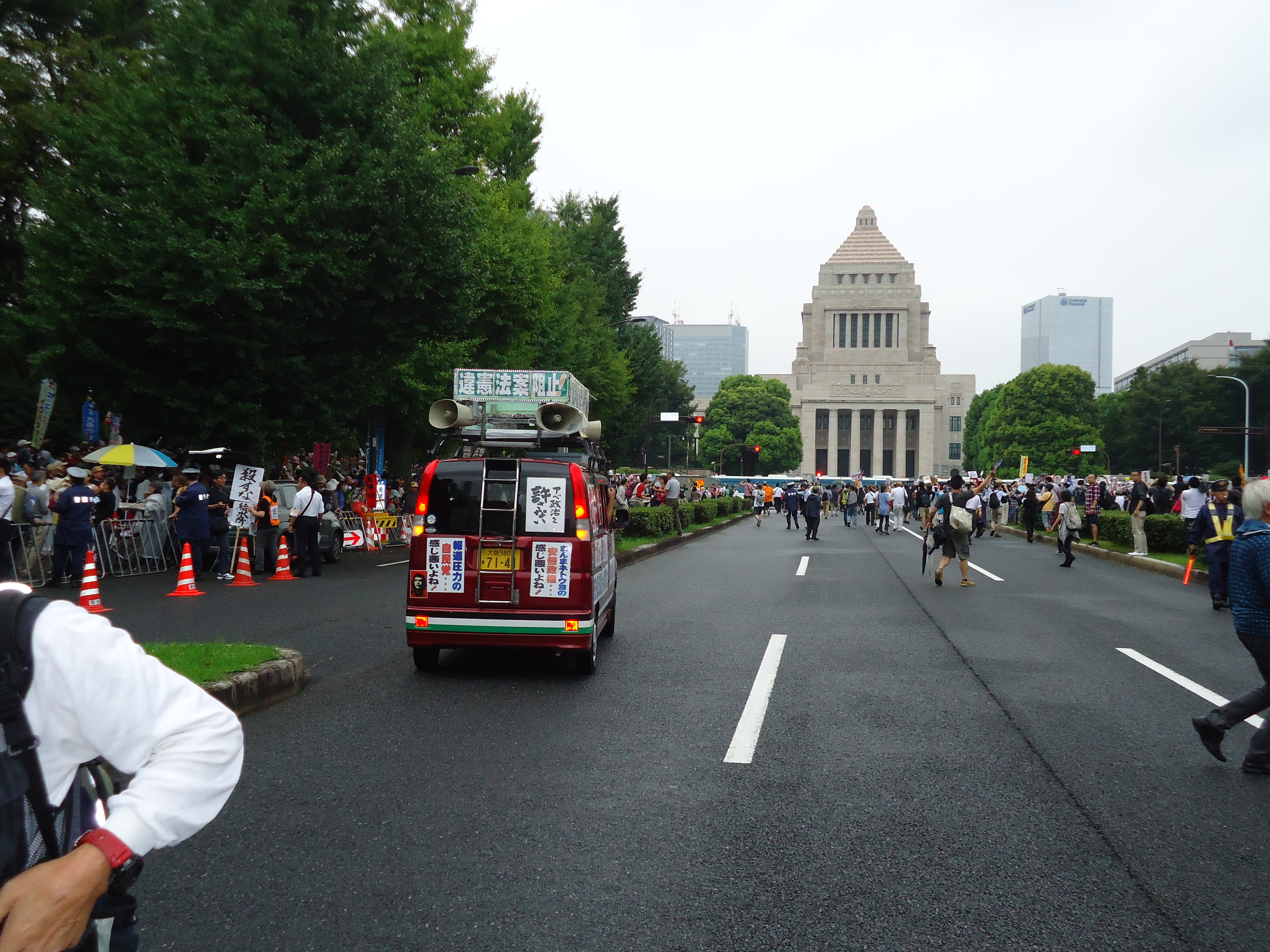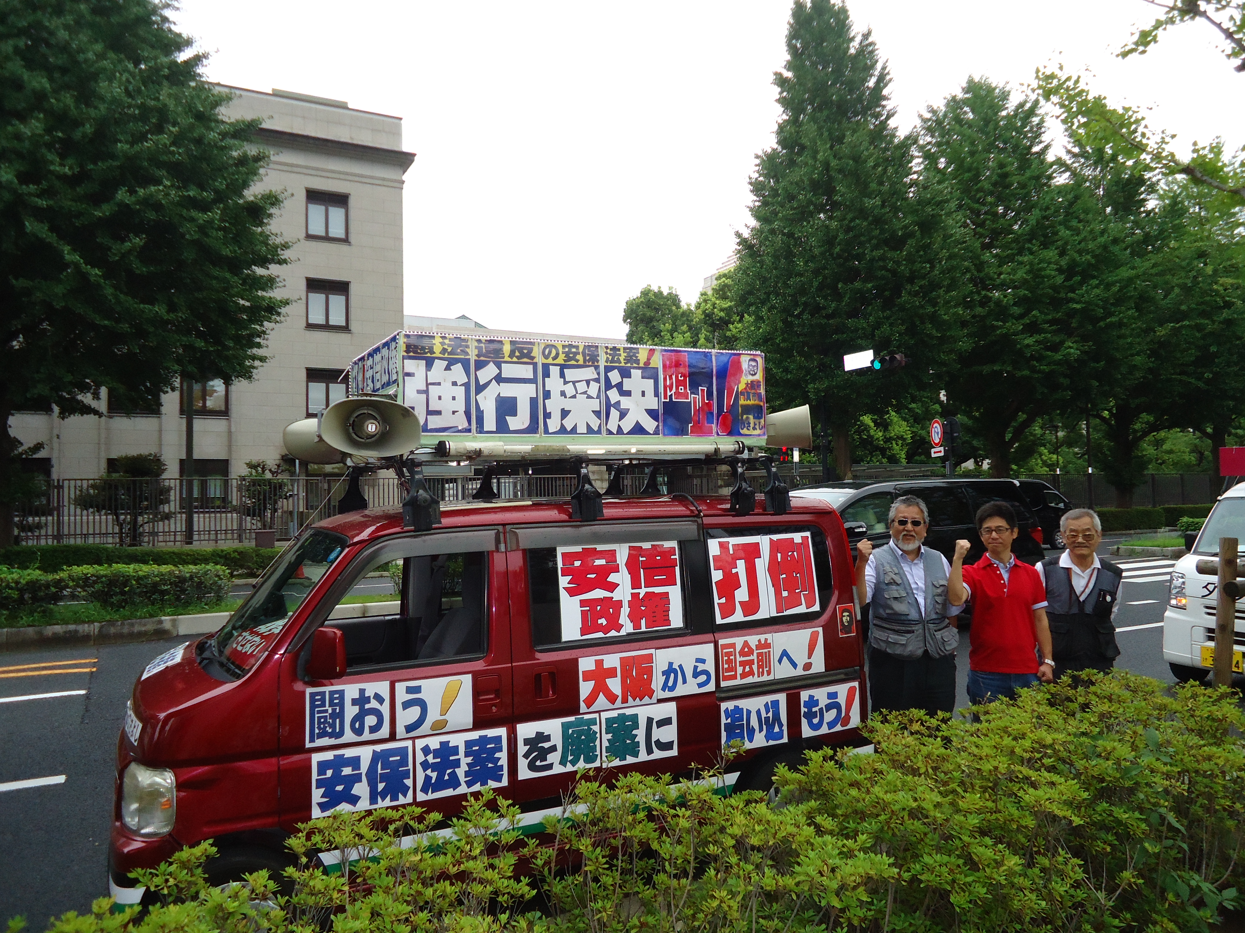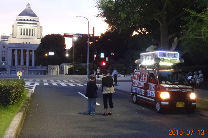 戦争法案の7/16衆院強行採決弾劾!戸田も国会闘争に看板カーで参加!(不当に車を止めた警視庁と40分間争う動画もあり)野火のごとく燃え広がる国民の怒り!8月9月の大闘争で法案粉砕・安倍自公政権打倒に突き進もう!
