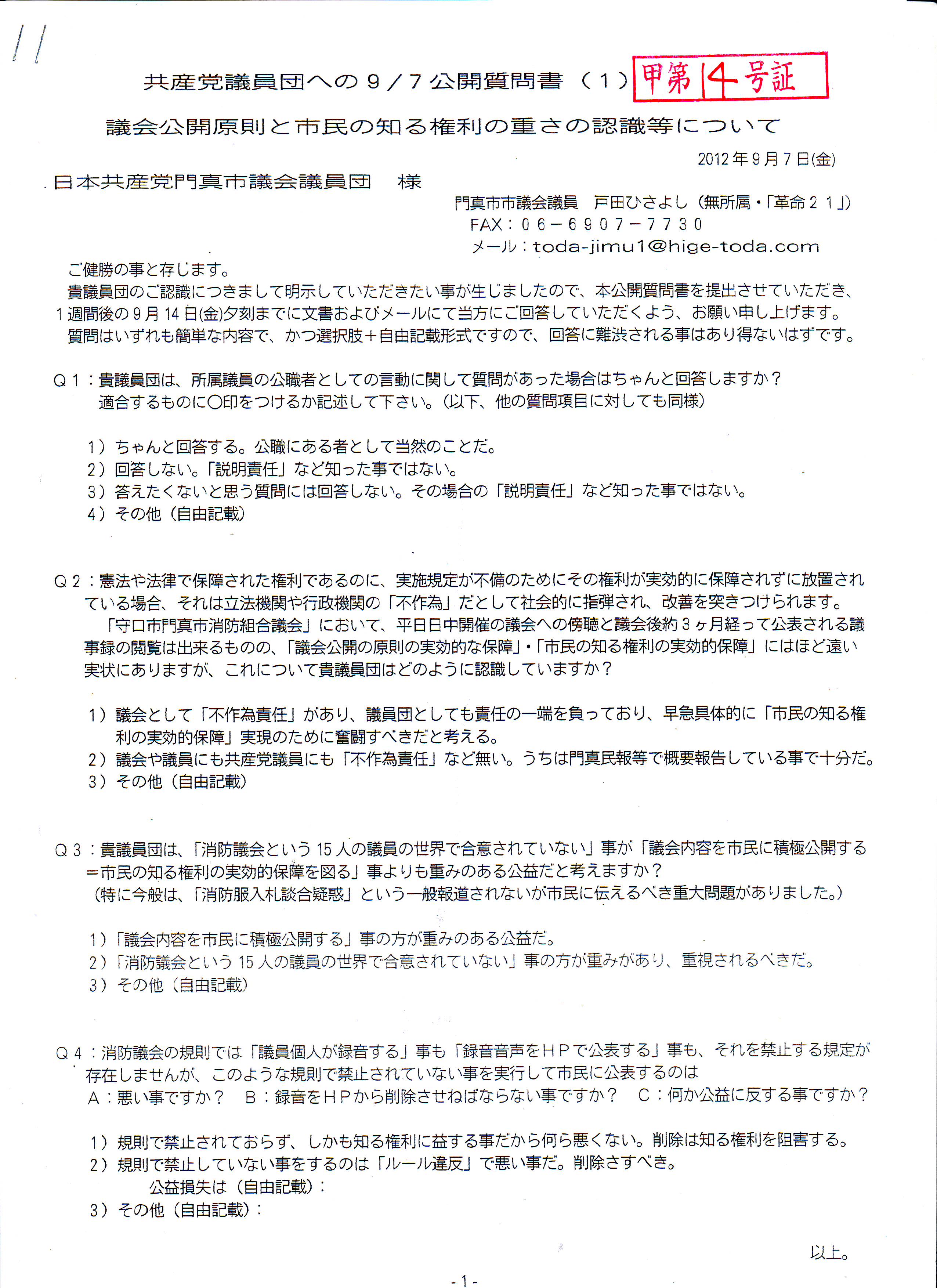| ●共産党答弁書全文紹介(中)■「戸田議員への永久回答拒否宣言」は「表現の自由」!? 戸田 15/4/18(土) 16:08 |